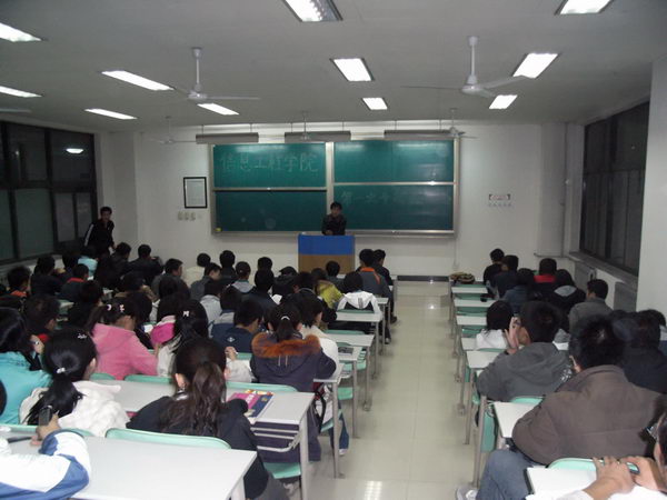 2008年11月30日晚七点,信息工程学院在修远教学楼1102教室召开了第一次学生干部培训大会,学院团委、学生会全体成员,08级各班班长、团支书参加了培训大会。学院党委副书记贺炳彦给全体人员做了如何做好学生干部的培训,会议由团委副书记王丹同学主持。