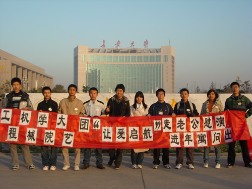 11月30日,为了积极响应国家主席胡锦涛同志提出的“八荣八耻”的社会主义荣辱观和“构建社会主义和谐社会”这一时代主题,认真贯彻落实“三个代表”重要思想促进社会主义精神文明建设,弘扬中华民族尊老敬老的传统美德,展现长安大学深厚的人文关怀,增强大学生社会责任意识与奉献意识,工程机械学院学生会大艺团在感恩节后到西安市老年公寓进行了以“让爱启航”为题的慰问演出活动。