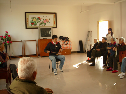 接下来,他们奉上了精心准备的文艺表演。古典的二胡悠扬着美妙的音乐,老人们听得聚精会神,如入其境;嘹亮的军歌如从战争年代飘来,回荡在我们的耳边,勾起了老人们革命时期的回忆;优雅欢快的舞蹈,让老人们赞不绝口;形象搞笑的相声,让老人们笑得合不拢嘴……