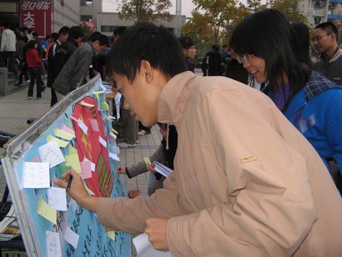 2008年11月5日下午,经济与管理学院06级电子商务班“纪念改革开放30周年”主题团日活动正式展开。下午5点,在安排布置妥当之后,团日活动正式拉开帷幕,同学各司其职、分工明确,一部分同学发“忆改革开放 现中华神威”的宣传单,一部分同学让路过的同学在便利贴上写下对祖国祝福的话语并贴于宣传板上,还有两名同学负责拍照纪录活动的过程……