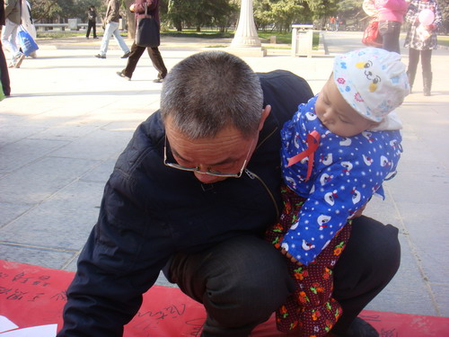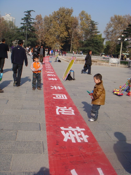 活动现场,志愿者们将121米长的签名横幅缓缓展开,“心系红丝带”的标语高高挂起,系有爱心标语的气球装点了起来,整个南广场被一种和谐的氛围所笼罩。活动中,志愿者耐心地为游客们讲解艾滋病防范知识,并号召大家携起手来共同“履行承诺、遏制艾滋”。游客纷纷在横幅上签上自己的名字,之后志愿者们为他们贴上了象征着防治艾滋病标识的红丝带,并发放艾滋病防治知识的小册子。短短几个小时的时间,一万条红丝带,已经系在了兴庆宫游客们的胸前,红丝带也随着游客们飘动在公园的各个角落。