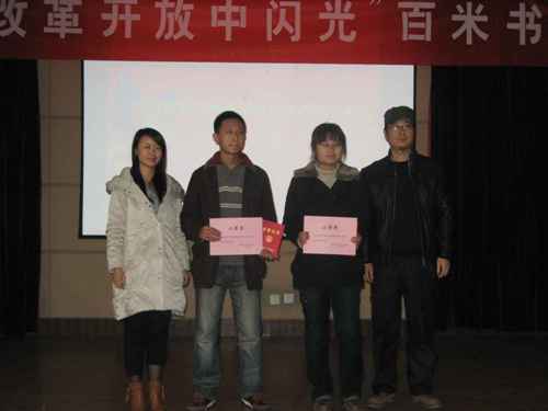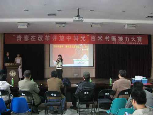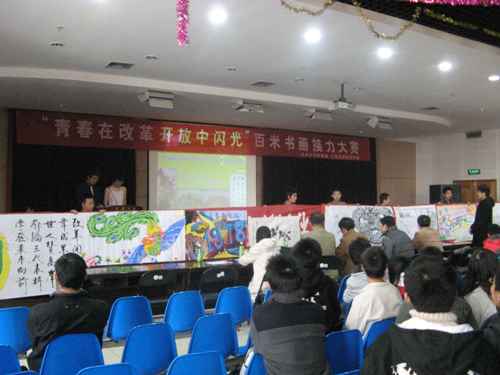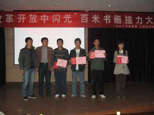 12月9日中午12点,由长安大学校团委主办、工程机械学院团委承办的“青春在改革开放中闪光”百米书画接力大赛评审及颁奖仪式在大学生活动中心三楼多功能厅隆重举行。本次评审及颁奖仪式邀请到的评委有:西安交通大学城市学院团委书记牛彦龙老师,长安大学校团委刘艳艳老师,建筑学院艺术设计系祁今燕老师,建筑学院艺术设计系石军利老师,工程机械学院工业设计系乔涵老师,工程机械学院辅导员时磊老师。