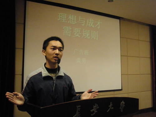 随着比赛规则的公布,比赛有序紧凑的进行着。选手们有的慷慨激昂,有的诙谐深邃;时而如澎湃之波涛,时而如涓涓之细流,高潮连接不断,掌声连续不止。经过近两个小时的角逐,行管班的乔晓娜同学和中文班的杨佳宁同学博得了头彩。08行管班获得了最佳组织奖。