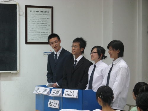 由于这是机械学院首次组织大型辩论赛,在第一轮比赛中难免有一些不足,但这些漏洞在本论比赛中得到了修正。首先,在着装上,选手一律穿正装,大家的言谈举止也更加规范和符合辩论赛的会场的要求;其次在准备上,选手们准备的材料也更加充分,语言更加清晰连贯,更具说服力,也增强了现场的互动与丰富了表演艺术。比赛流程中辩手也充分利用有限时间,句句紧扣辩题,使得辩论充满了紧张的战场气氛。