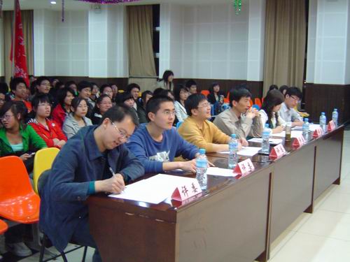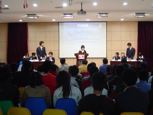 19:00整辩论赛正式开始,正方代表队由来自08级市场营销专业的陆士群、赵强、刘钟垚、贺超四名同学组成,主张“青年成才的关键是自身能力”;反方代表队由来自08级物流工程专业张田琳钰、孙国栋及市场营销专业的蔡晶、罗懿四名同学组成,主张“青年成才的关键是外部机遇”。正反双方就辩题展开了激烈的辩论,赛场气氛紧张激烈,双方辩手针锋相对,唇枪舌剑,你来我往,却又不失风度,侃侃而谈。经过陈辞立论、攻辩、自由辩论、总结陈辞几个环节,双方以生动形象的论据、坚定有力的论点,诱敌深入的辩论技巧,据理力争,为在场的各位嘉宾和同学展示一场精彩的思想碰撞大赛。
