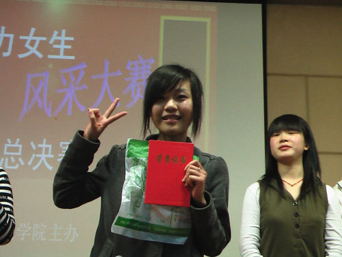 女生不仅因为美丽而可爱,而且因为可爱而美丽。在魅力女生大赛的舞台上,来自不同学院、不同专业的11名同学的表演让台下的观众充分感受到了她们的魅力。在才艺展示环节中,有唱着“长亭外,古道边••• ”走上舞台的江南女孩带来的极具感染力的《左边》;有充满激情又不乏优雅的青春动感的伦巴表演;有国粹京剧《红娘》选段的再现;有搞笑的校园小品;有美妙多姿的孔雀舞,更有巾帼风范的中国武术表演。在知识问答环节中,选手们更有不凡的表现,来自人文学院的牟昊更是完美地答对了十道题,得到了本轮比赛的全场最高分。最后一个环节的临时组合表演,不仅展现了选手个人出众的才艺,更培养了选手之间团队协作的能力。