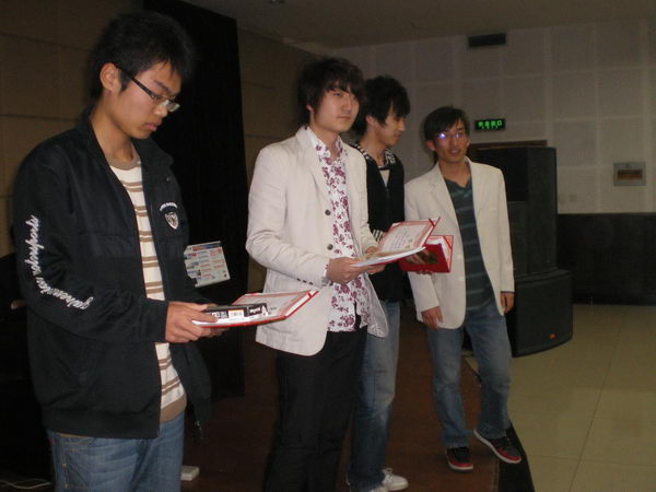 在动感的音乐中,晚会正式开始了,大屏幕上播放着比赛录像,同学们津津有味地欣赏高手过招时的精彩瞬间。随后,主持人宣布获奖人员名单,魔兽1Vs1、CS、DOTA三等奖获得者分别为李爱勇、nTw[gZh]Team、WS11,二等奖分别为邱元凯、GPS、FGF,一等奖分别为宋嘉、MYM、BTG,他们在热烈的掌声中依次上台,曹贵鹏、毕邦超、计协创业部部长刘晓峰为其颁奖。一张张阳光年轻的脸上洋溢着胜利者的微笑,手执荣誉证书和奖品,他们收获的还有成功的喜悦。