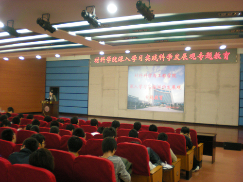为了响应校党委提出的在大学中深入学习实践科学发展观活动的号召,促进学习实践活动的开展,并使同学们深刻认识学习实践科学发展观活动的重要意义, 4月12日晚 ,我院在会议中心学术报告厅向渭水全体同学开展“深入学习实践科学发展观专题教育”活动,我院党委副书记 高雁北 老师做了专题讲座,院团委书记何红娟老师和各级辅导员老师到场参加了此次活动,活动由何红娟老师主持。