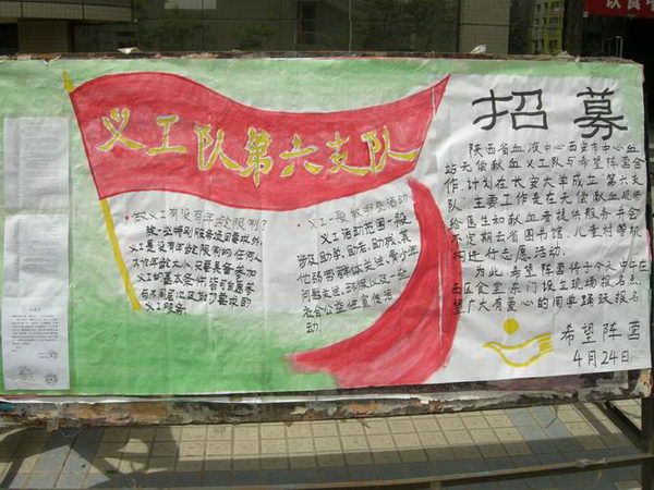2009年4月24日 在西区食堂兹兰苑东侧门口,希望阵营举办了义工第六支队招募活动。在全体工作人员的精心策划与协调组织下,此次招募活动获得了圆满的成功。