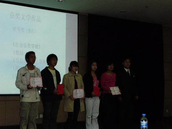 然后主持人开始宣布获奖作品与作者名单,主要包括文学方面,摄影方面,绘画方面,封面设计等,从几百份作品中脱颖而出的作者获得由资源学院颁发的证书以及奖品。获奖作者依次上台由,团委书记刘会涛老师,臧萌老师,魏方辉主席为他们颁奖,又一次把现场气氛推向最高潮。