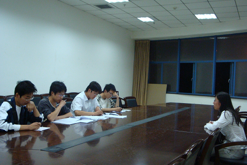答辩会于晚7点正式开始,十点结束,历时三小时之多。整个面试过程中,答辩的同学们纷纷表达了自己的特长和意愿,面对评委的提问,各个思维迅速,答辩巧妙,面试选手可谓才华横溢、热情似火。等候室里,选手们在等候之余,也不忘相互认识,交流思想,热烈讨论一番,整个场面一片热情融洽。