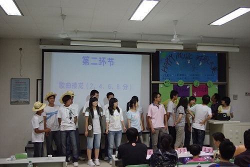 经过第一环节才艺展示之后,比赛在轻松愉悦的气氛中进入真正的对歌阶段。第二环节,歌曲接龙。经过抽签,题目是每个队轮流唱出含有“爱“字的歌曲,直到其中有队伍接不下去则在此轮种遭淘汰,进行到角逐出本轮的名次,依次加8,6,4,2分。现场倒计时的声音,参赛者的歌唱声融为一体让整个赛场精彩激烈,其中各种各样的歌曲接唱体现了学院各参赛队的激情与活力,尤其是儿童歌曲,民歌,粤语歌等等的出现,当然现代流行歌曲也格外出彩。