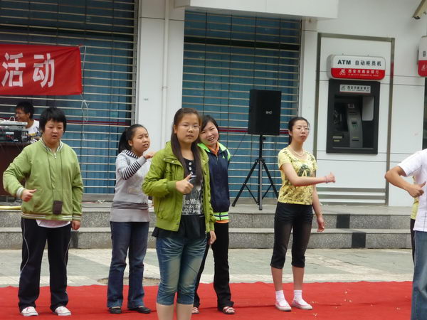 第一个上场的是新城区文艺团,大婶们以热情奔放的舞蹈吸引了过往的群众,场下的志愿者负责给群众讲解关于阳光家园的宗旨和目的。接下来上场的是西安建筑科技大学的志愿者,他们一首《阳光总在风雨后》,唱出了人生必须要经历挫折才能有美好的未来。第三个上场的是阳光家园的成员,他们伴随着音乐《好日子》在红地毯上跳着整齐的舞蹈,他们的每一个动作都是那么的可爱动人。很明显他们肯定排练了很多次。第四个上场的是西安外国语大学,她们以中英结合的方式朗读诗《爱》,使整个活动倍添文才。接下来,西安邮电大学演唱了《和你一样》。最后上场的是我们社团,我们与阳光家园的学员共同表演手语《爱的奉献》。我们用无声的双手表达出‘只要人人都献出一点爱,世界将变成美好的人间。’场下有一处非常独特的风景——四五个小朋友也在那挥舞他们的小手,他们可爱的动作犹如天使在召唤人间的真爱。在表演节目的同时,我们志愿者分工合作,我们希望阵营的志愿者负责音响以及为群众讲解关于阳光家园的意义。其他志愿者组织义卖和调查群众对阳光家园的了解度。