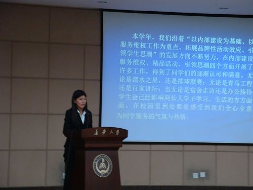 朱绍明主席也进行了发言,汇报了一学年来的工作。她给我们带来了她参加竞选时的PPT,这也是她一年的承诺,她也一直努力按照自己的承诺把握方向,使得学生会这一年取得了不俗的成绩与进步。“以内部建设为基础,以服务维权为工作重点,同时拓展品牌活动效应”,这是学生会这一学年的方向。朱绍明主席的这一年绝对是学生会受益的一年。