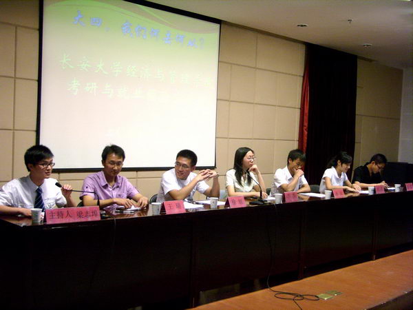 2009年6月22日晚,我院在渭水校区朝晖大学生活动中心三楼多功能厅举行考研与就业经验交流会。来自2009届交通运输、会计学、统计学、信息管理与信息系统、电子商务、物流管理等专业的6名应届毕业生代表,与渭水校区的学弟学妹分享考研与就业的心路历程。交流会邀请2006级辅导员王翀老师参加,学生会主席梁志埠同学主持交流会。