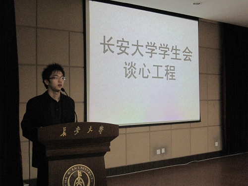 2009年10月31日 晚7:00,长安大学校学生会谈心工程在朝晖大学生活动中心三楼多功能厅举办。学生会主席张晓明,副主席宁一瑄,张同隆,蔡薇,张健,主席助理彭朋及学生会各部长、部员参加了此次活动。该活动是由长安大学校学生会秘书处主办的一项以交流互动为核心的活动,主要是为了加强校学生会内部主席团与各部门以及各个部门之间的联系,加深彼此之间的了解,增进工作生活中的交流与沟通。