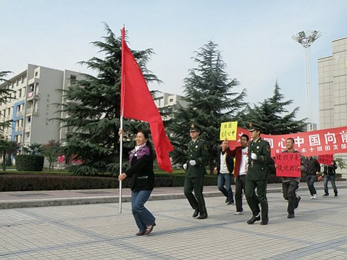 校园国旗传递开始前举行了国旗传递仪式。在传递仪式上学办副主任07级辅导员陈德育老师,充分肯定了此次团日活动的意义,并希望同学们通过这项活动增强爱国意识,努力学习,健康成长,以自己的实际行动报效国家。此次活动,从西区兹兰苑出发,途径修远大道、东区树惠园,最后回到起点。此次活动得到广大同学的热烈响应,除07级国防生外,其他老师和同学们也纷纷加入了护旗和传递队伍,他们手持国旗和祝福标语,高呼爱国口号,以真情表达着对祖国深厚真挚的情感,使整个校园充满着对党和祖国的爱。