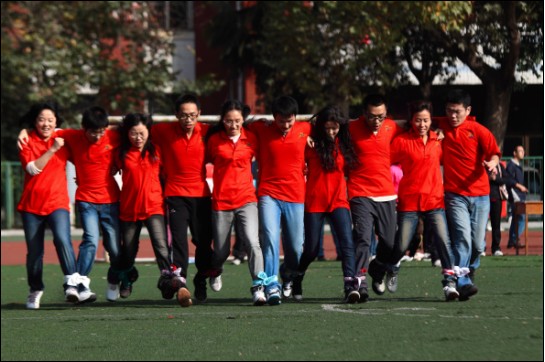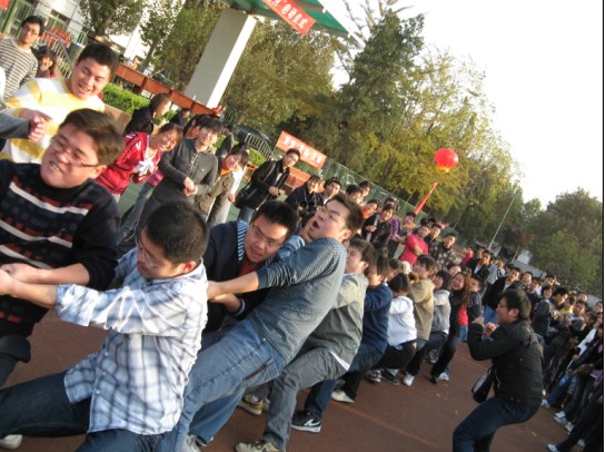 本次进行的活动项目有趣味接力赛(瞎子背瘸子)、同舟共济(跳大绳)、拔河比赛、多人绑腿跑。运动员们个个精神抖擞、意气风发,在他们看来这次比赛代表的不仅是个人的荣誉,更是一种团队协作精神的体现。运动场上时而见队员们随绳摆上下起舞,时而见绳上红线在两队之间左右横移,旁边的啦啦队员们疯狂的呐喊、助威,赛场上到处充满着青春的活力和激情,呐喊声与欢笑声交织成一片。在努力团结合作下,全校各班参赛选手经过激烈的竞争,产生了团体协作项目中各项目的前三名: