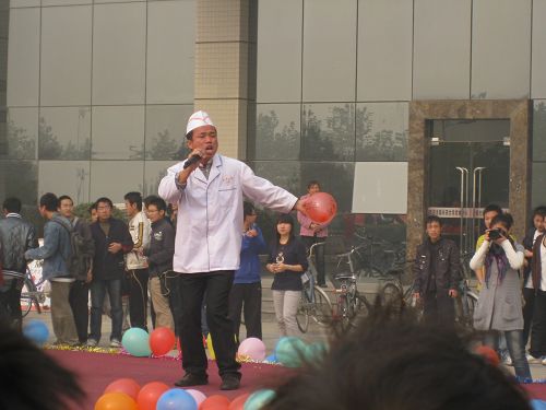 迎着凉爽的秋风,以“弘扬中国美食文化,倡导校园健康生活”为活动主题的饮食文化节,在全校师生的热烈期盼下隆重举行。活动开始前是精彩纷呈的开幕式,在开幕式上,校学生会主席张晓明做了简短的发言。他说:“在现在这个甲流疫情严重的时期,希望此次活动能够丰富同学们的课余生活,在同学们享受物质文明和精神文明同步发展成果的同时,也能使饮食文化节得以向更高的一个层次发展。”在现场同学的掌声中,精彩的文艺演出点燃了全场同学的激情:歌曲《We will rock you》独唱,获得了场下阵阵喝彩。由武术协会同学表演的双截棍,以其精湛的武艺和舞技,征服了台下观众。接下来是食堂师傅的演出,更是把现场气氛推向高潮:杨亮师傅的街舞——《看我72变》赢得一片叫好;赵刚师傅的独唱《今天》更是使得场下掌声雷动经久不息。