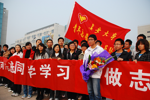 11月8日上午9时30分,长安大学孙云进同学捐献造血干细胞欢送仪式在东区树蕙园广场举行。我青年志愿者服务总队同学参加了欢送仪式,并向英雄献上了鲜花。