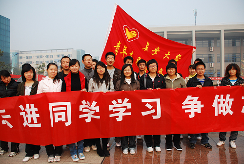 我青年志愿者服务总队的同学早8点30分就来到了会场,悬挂横幅、布置会场,同学们还拉起了“向孙云进同学学习 争做志愿者 创造新生活”的横幅,现场井然有序。为了表示对孙云进同学的敬意,我服务总队还特意为其准备了一束鲜花,并表示了总队对于孙云进同学的深切问候,祝福他能早日康复,一路平安。