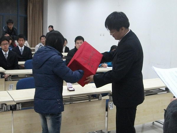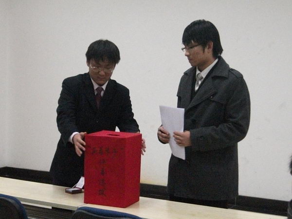 活动开始由公关部部长陈天雷公布选拔名额及选拔方法,为保证活动公平公正的进行,本次评选采取抽签方式。副部长程迷则负责摇箱并将卡片号码示众。