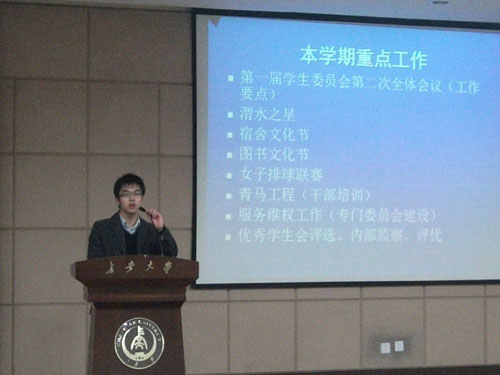 会议开始,学生会主席张晓明就本学期工作重点做了介绍,他要求学生会的成员,应该统一思想,多学习,多思考,多总结。接下来是秘书处等部门作了本学期的工作计划与安排。