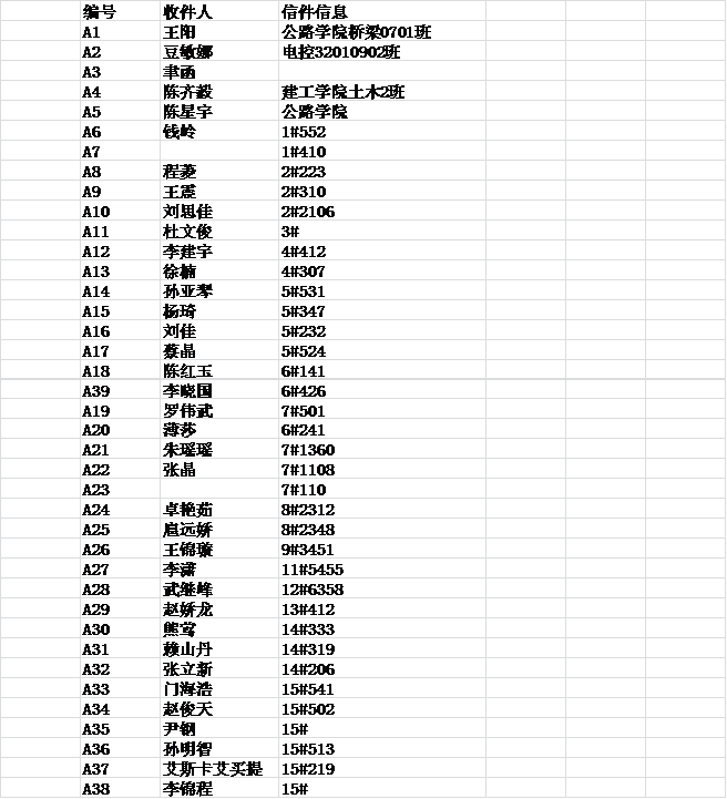 为了让校门口那些长期无人领取的信件尽快到主人手里,长安大学学生会重新启动了“死心复活”服务小组。小组将定期在东西区失物招领栏里及学生会网站上公示信件,相关同学可凭学生证到学生会办公室领取。请同学们记住自己的编号,方便查找,以下是第一期公示名单: