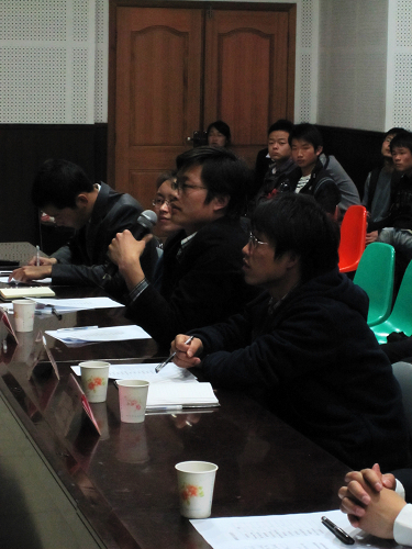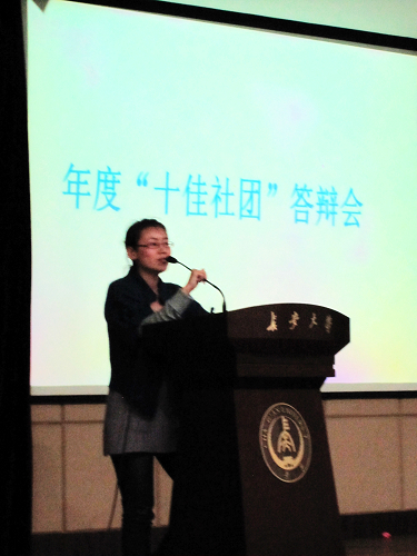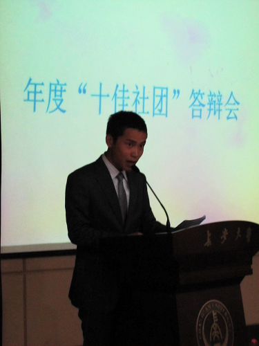 休会20分钟后,年度“十佳社团”答辩会正式召开,三位团委老师和社联主席团出任评委。Dancing Club负责人覃路捷拉开答辩序幕,接着,黄土地文化社、希望阵营、古典音乐协会、Touching曙光协会、博弈协会、长大国学社、武术协会、支农志愿者协会、摄影协会、碧连天环保协会和英语联盟为各自社团进行了精彩答辩。团委老师在各社团答辩后提问并给予建议。