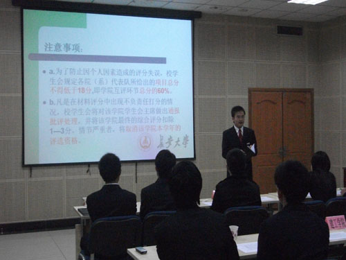 2010年4月17日晚6:30,长安大学优秀学生会评选会议在朝晖大学生活动中心二楼培训室召开,出席本次会议的有长安大学学生会副主席崔磊,以及各院学生会主席团代表。