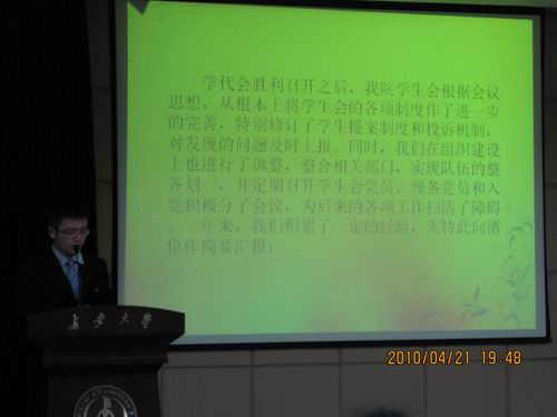 最后,团委朱先前老师对本次答辩进行了总结。他首先肯定了今年学生会工作的进步,特色活动越来越多。随后,他说优秀学生会评选过程中各学院不仅仅是在PK,更重要的是交流,互相学习,互相提高。最后朱老师谈到了他对于学生会工作的几点思考:一是希望各院系学生会品牌活动做好传承;二是希望各院系学生会充分调动基层班级的力量,尽量解决当前学生活动参与的二八现象;三是希望各院系学生会做好自己的定位,找准自己的立足点,以人为本,围绕同学们的专业需要、能力需要不断开创学生会工作的新品牌和新成绩。