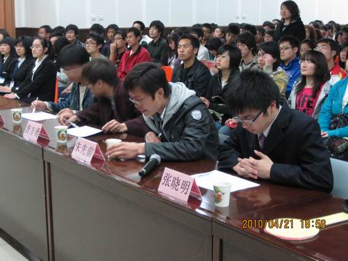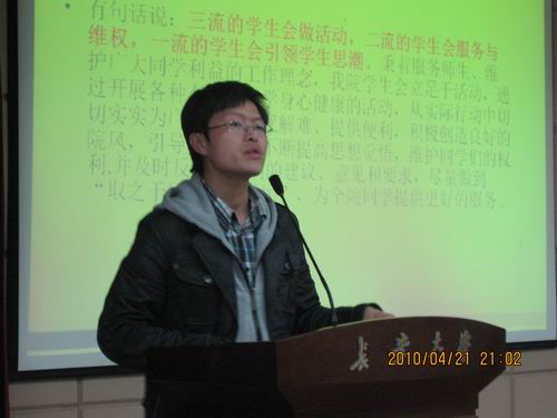 4月21日晚7:00在朝晖大学生活动中心举行了2009~2010年度优秀学生会评选最后一个环节——现场答辩会。学工部教育管理科查方勇老师、校团委朱先前老师、张可老师、学生会主席张晓明担任答辩会评委嘉宾。