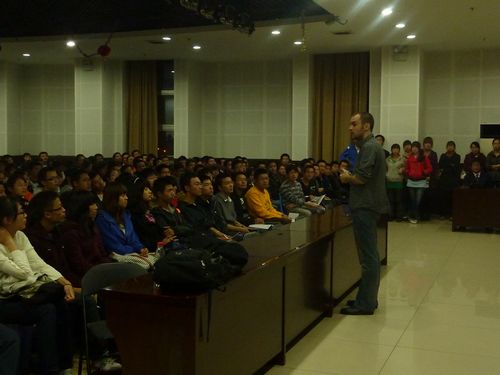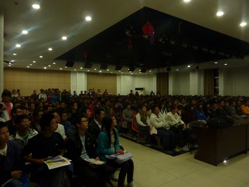 讲座6:30正式开始,长安大学渭水校区朝晖大学生活动中心内人头攒动,近1000名学生前去大厅,座无虚席,部分学生还站着听完了讲座,整个演讲过程气氛活跃,基本都由互动的方式进行。学生们都兴致高昂,有的学生们最后还让老师签名以做留念。演讲在热烈的掌声中开始,首先,王老师作自我介绍并与同学沟通,王老师讲了他来中国的一些有趣的经历,并讲了他中文名字的由来。他的幽默不时赢来热烈的掌声,接着王老师强调了英语的重要性,诚然,在全球迅猛发展的今天英语在各个专业所起的作用不言而喻,然后王老师又肯定每人都能学好英语,坚定了大家学好英语的信心,他又建议同学们背单词需要充分调动各种感官,切实做到听说读写相结合,方能达到背单词的最佳效果,至于如何学好英语,练习是关键,他强调做任何事实践是最重要的。例如一个只看别人打篮球的人永远学不会打篮球一样。另外,他还总结了学好英语的三个重要环节,交流、 阅读还有模仿。最后,他指出一切成功的背后都必须有一个完整的计划,并坚持自己的计划,方能达到自己的目标。