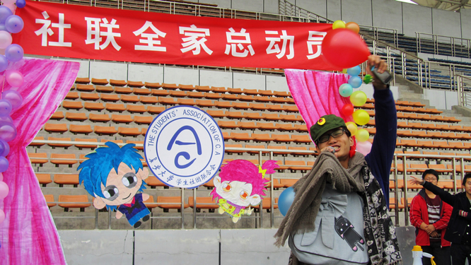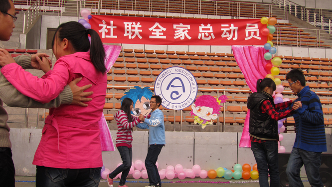早晨,宁静的东区操场内就出现了组织部、宣传部同学们忙碌的身影。在他们的尽心组织预策划下,活动的舞台逐渐搭建了起来。可爱的卡通人物,以及五色的气球,伴随着社联以“合”为主的社标出现在了人们的眼前,静候着之后这一场激情的狂欢活动。