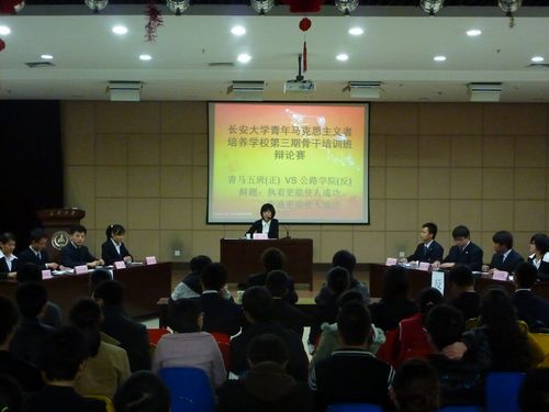 11月8日晚7:00,以“博学雄辩展才华,创先争优添风采”为主题的长安大学青年马克思主义者培养学校第三期学生骨干培训班辩论赛在大学生活动中心三楼多功能厅举行,出席本场比赛的评委有校学生会主席王垚,哲思协会副主席张思远及世博杯辩论赛优秀辩手徐靖。