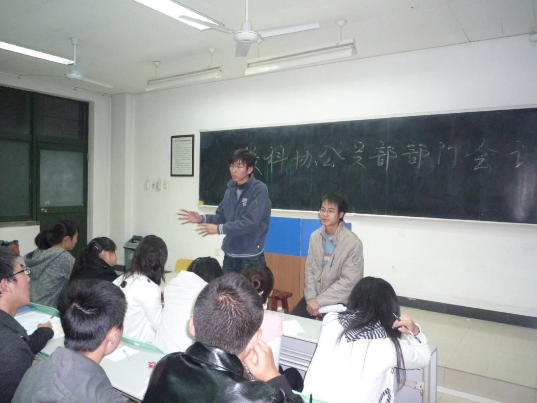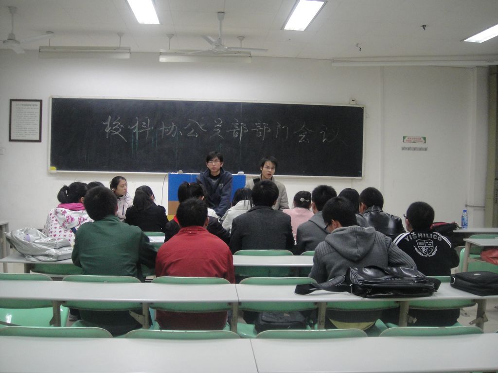 2010年11月8日晚8点,长安大学大学生科技创新与创业协会公关部部门会议于修远3302教室成功召开。校科协副主席杨战雄、公关部部长石涌泉、副部长吕咪咪、副部长周彦涛、副部长孟莎莎以及全体10级公关部干事参加了此次会议。