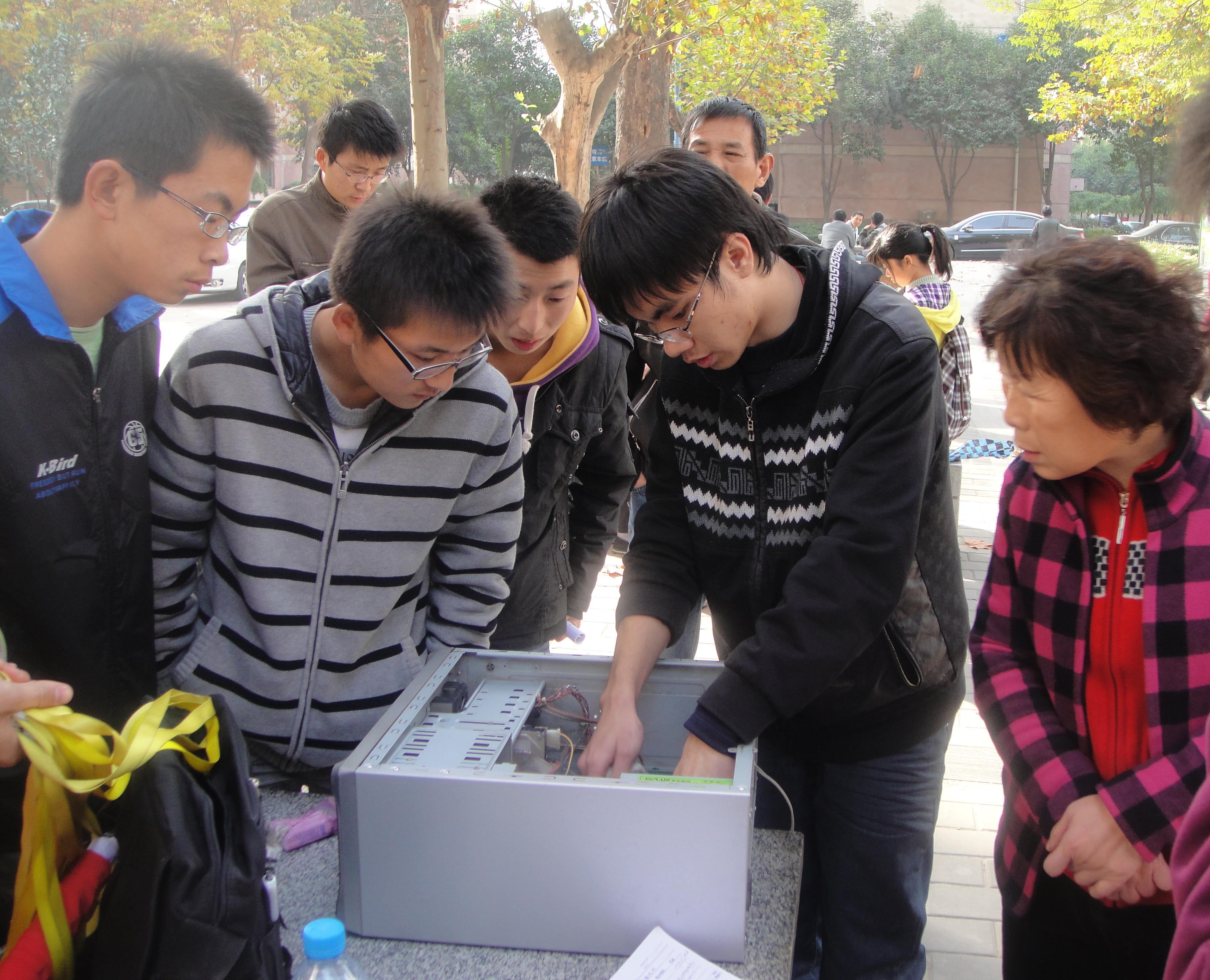 从渭水到校本部,一个多小时的车程,怀着激情出发了。因为总队之前在这里做了很多宣传工作,十点十分到达之后,摆好展台,就立刻有需要维修的机子的居民前来咨询。技术人员跟着机主上门去维修,第一批分三组,分别是计协技术发展中心副主任李玮,硬件部部长陈桂全,网络部部长刘镇生,他们都带着大一的。机子的问题可谓各式各样,有图像不清楚的,有网速太慢的,有需要重新装系统的等等。技术人员在总队人员带领下找到机主家为他们维修,也有将笔记本或者主机拿到现场来修理的。技术人员迫不及待想要修好机子,无论问题多么复杂,他们都是那么认真耐心,哪怕是用纸巾清理几年都未清理的主机箱。每修好一台,机主是满面笑容的表示感谢,技术人员感到的是温馨。