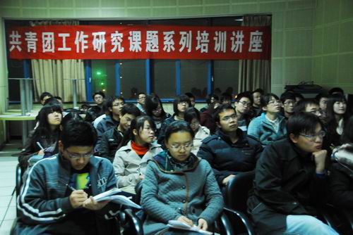 11月25日晚7点,共青团工作研究课题系列培训第二讲在朝晖大学生活动中心视听室举行,60项共青团工作研究课题参与人员参加了培训。培训由校团委老师刘艳艳主讲。