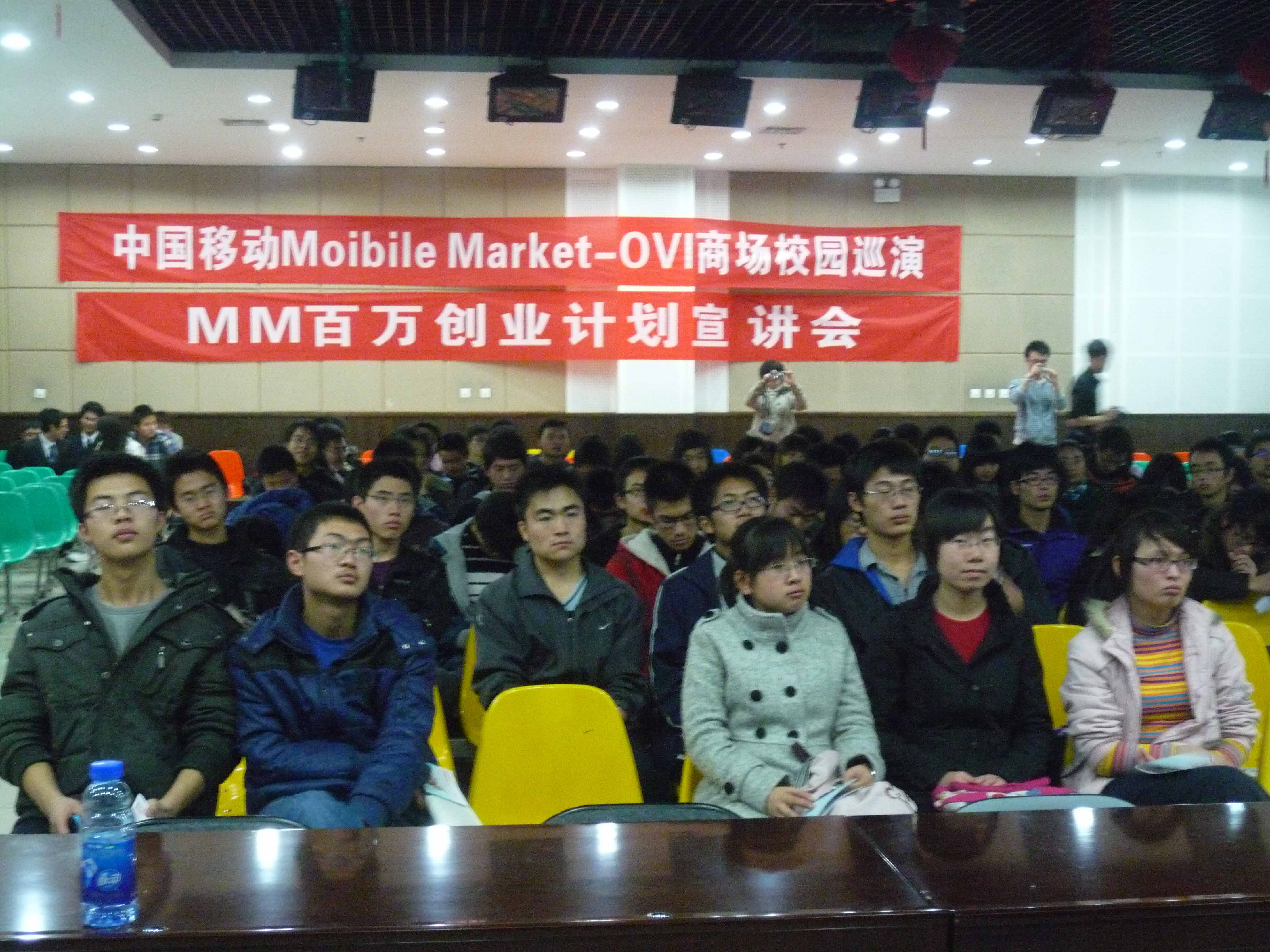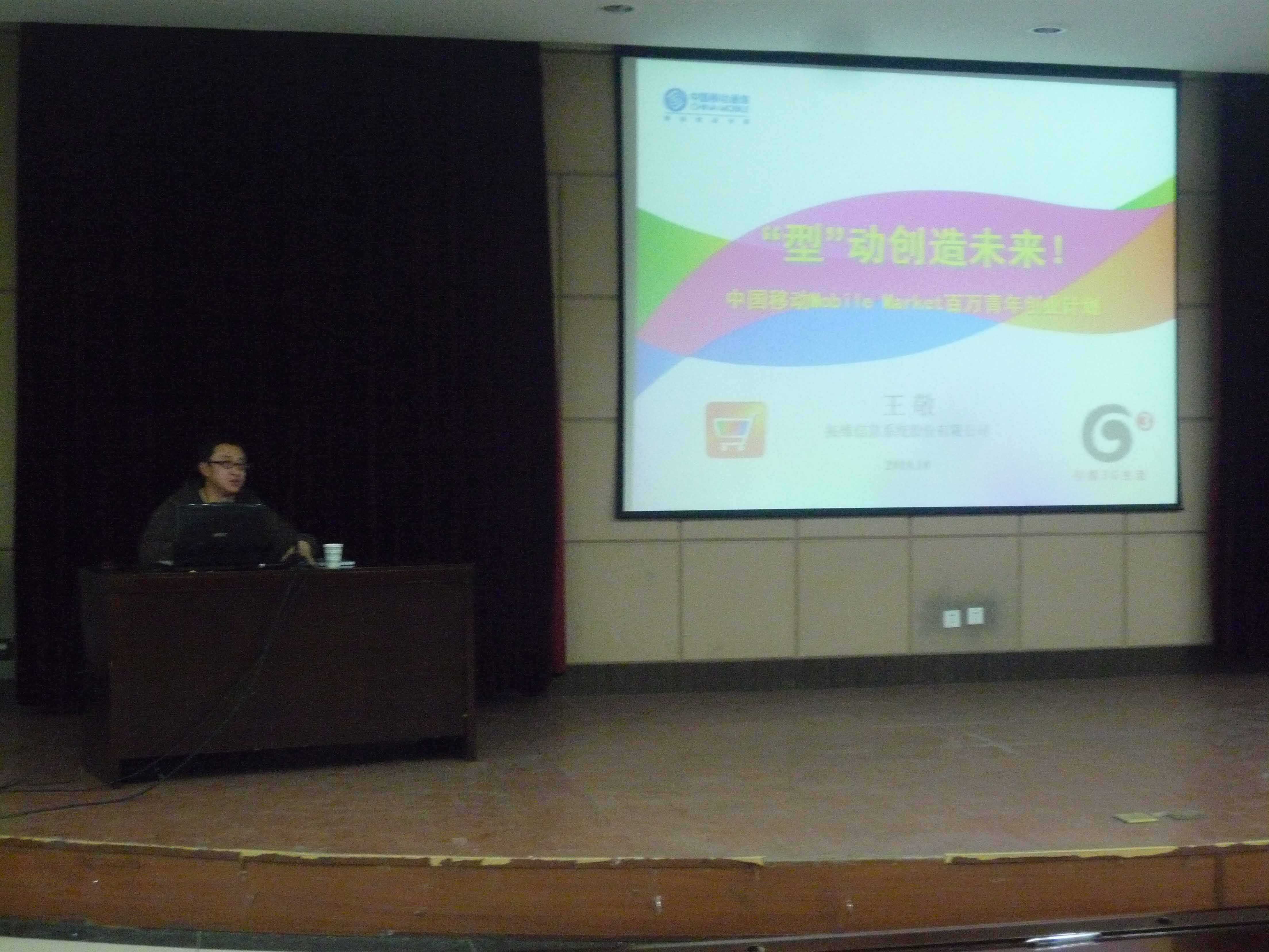 2010年12月19日晚七点,中国移动“型动创造未来”——Mobile Market百万青年创业计划培训会第二场在朝晖大学生活动中心三层多功能厅隆重举行。参与本次活动的有各科技类创业类学生社团负责人、各院系班级科技与实践委员、学生创业活动积极分子等。拓维信息资深专家王敬先生担任本次培训会的讲师。