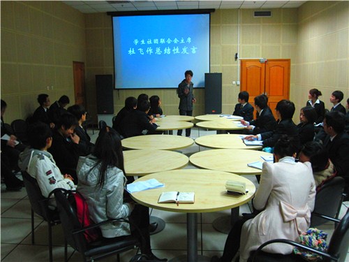 2010年12月24日晚七点,学生社团联合会在朝晖大学生活动中心成功召开本学期的部门工作总结会议。秘书处大一干事李雷、杨小翠主持会议,社联主席杜飞,副主席杜汶卓、陈晨出席会议并发表重要讲话。