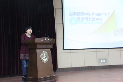 接着,团学新闻中心代理秘书长龚少博老师作了总结。她表示本学期工作繁忙,挑战与压力共存,鼓励同学们任劳任怨、一丝不苟,并期待与大家的合作。她还希望大家保持对工作的热情以及团学新闻中心的凝聚力,使大家在能够在合作中学习,在学习中成长。