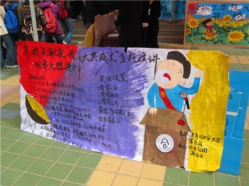 六十年风雨缔造出长大学子特有的人格品质,六十年成长创造出桃李天下的辉煌。正是这一代又一代的长大人,在祖国各个建设岗位发挥着无比重要的作用;正是这一代又一代的长大人,让母校为之骄傲,让前赴后继的长大学子不断攀登向上。校社团联合会自成立以来,在校党委、校团委的正确领导以及深切关怀中,不断成长,完善自身。为更好的迎接母校六十周年校庆,营造出热烈的欢庆气氛,社团联合会通过各个渠道进行宣传。在每幢宿舍楼的宣传板都张贴宣传海报并及时更换,以求大家对校庆活动保持足够的关注度。另外,社团联合会还绘制校庆宣传专用画板十余件,在东西区食堂门口进行长期宣传。