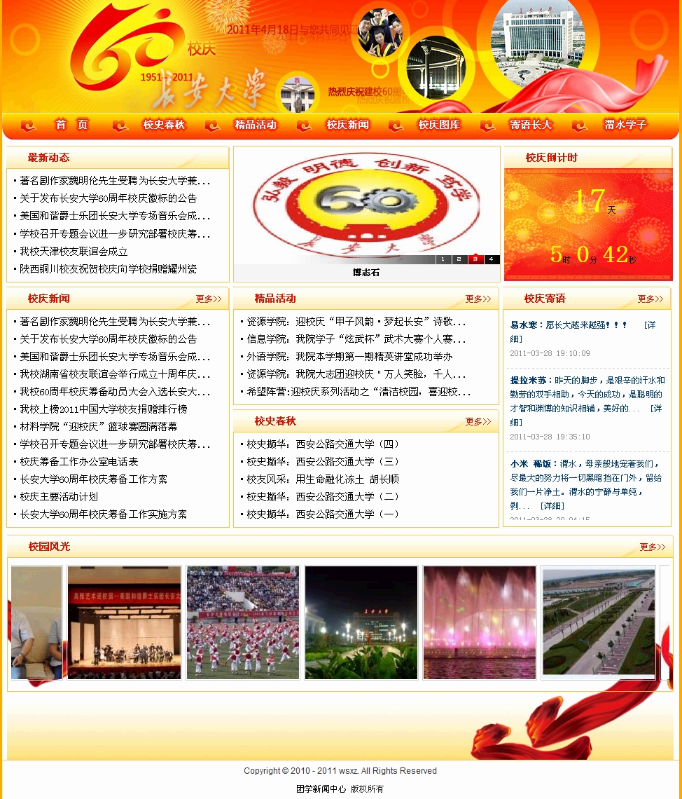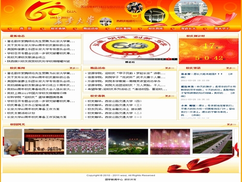 作为长安大学最"E"流的校园网络服务,信息门户网——渭水学子网,在母校 60周年华诞来临之际,特别推出的校庆专题网站(http://60.wsxz.cn)旨在透过团学新闻中心自己独特的新闻视角展现长大学子对校庆美好的期待和迎校庆精彩活动的最新动态,用网络的语言传递广大学子对母校深深的祝福和真挚的爱,同时也表达了团学新闻中心全体成员对学校的祝福与热爱。