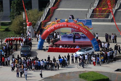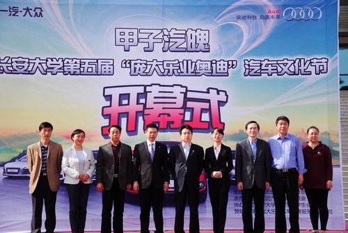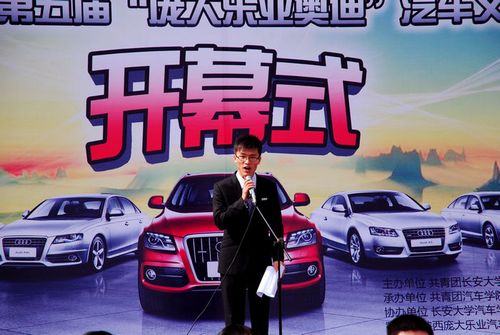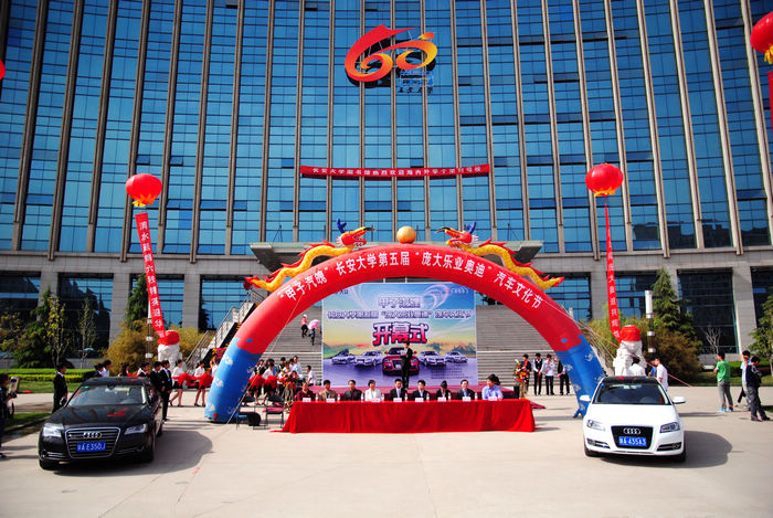 2011年4月15日下午,“甲子汽魄”长安大学第五届“庞大乐业奥迪”汽车文化节开幕式在我校渭水校区逸夫图书馆广场隆重举行。出席开幕式的有陕西庞大乐业汽车销售服务有限公司总经理徐艳平先生、市场部总监郑颖女士,我校渭水校区办副主任张步宏老师、学工部副部长王冰老师、共青团长安大学委员会副书记张侠老师、渭水试验场管理办公室主任李宪民老师,汽车学院党委书记肖润谋老师、党委副书记张增社老师、学生办公室主任杨杨老师、汽车学院各年级辅导员、长安大学各学生组织负责人及汽车学院学生代表200余人。