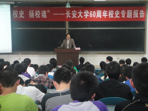 2011年4月16日14点30分,在长安大学渭水校区图书馆东侧1011教室,由共青团长安大学委员会主办,建工学院团委和大学生科技创新与创业协会联合承办的“学校史 扬校魂”——长安大学60周年校史专题报告成功召开。校史编辑项目组副组长、政治学院副院长段联合教授,校团委姬国斌老师,长安大学就业与发展服务中心丁珊老师,校科协主席王青山出席报告会。