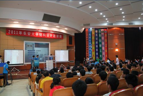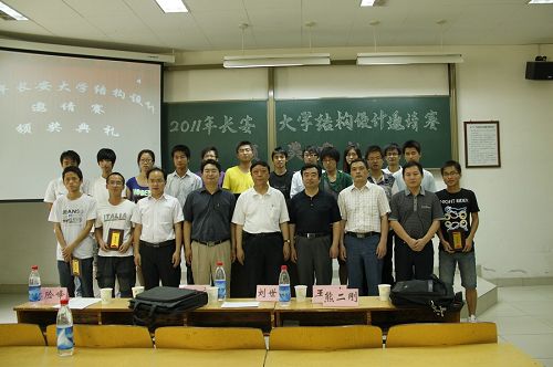 2011年5月19日12点,由长安大学教务处、校团委主办,建筑工程学院承办的“2011年长安大学结构设计邀请赛”颁奖典礼在长安大学渭水校区WM1101教室举行。建工学院党委副书记刘世良、副院长袁卫宁,土木工程专业特色办主任王步,混凝土与砌体结构教研室老师熊二刚,建工学院学办主任李险峰、团委副书记黄小乐,及获奖18支团队出席了颁奖典礼。