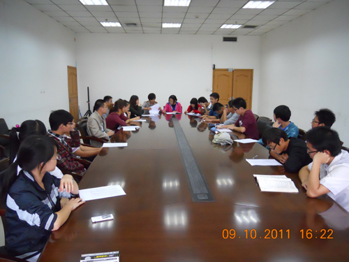 2011年9月10日16:30,社团联合会理论学术分会与社团的第一次见面会在朝晖大学生活动中心一楼会议室顺利召开。参加会议的成员有社联理论学术分会部长刘美君,副部长徐毓斌、邵海旭以及理论学术类社团的主要负责人。