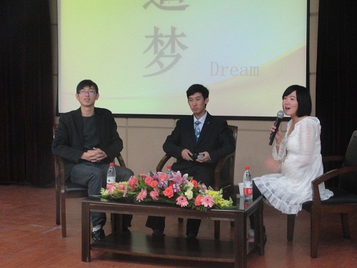 讲座开始后,马兆鑫学长首先作了简短的自我介绍。随后,在与主持人的交流中,他描述讲诉了自己的创业经历,并提出了“贵在坚持”的观点,让与会者了解了自己创业的大体情况,用真实的事例向观众介绍了一个创业者的经验。接着,主持人将杨战雄学长邀请上台,在他简短的自我介绍之后,与大家分享了自己跟马兆鑫学长经历的奇闻趣事,向读者讲述了自己眼中的马兆鑫。同时,杨战熊学长向大家介绍了自己参加“挑战杯”的心得体会,指出“一切跟着技术走,一切围着市场转”的深刻见解,获得了观众的认同。