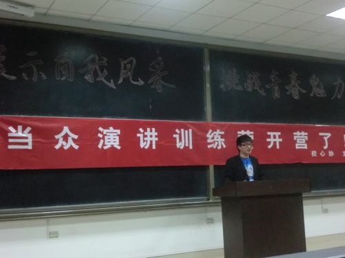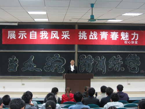 “展示自我风采 挑战青春魅力”,10月30日晚6:30,校心协第七届当众演讲训练营在图书馆东侧教室拉开了帷幕。参加该活动的嘉宾有校心协主席马晓彤,副主席李先斌、薄明俊、孙雅菲、赵康帅,首席秘书长沙颖洁以及校心协各部门部长代表。300余名参赛选手参加此次活动,并进行了个人风采展示。