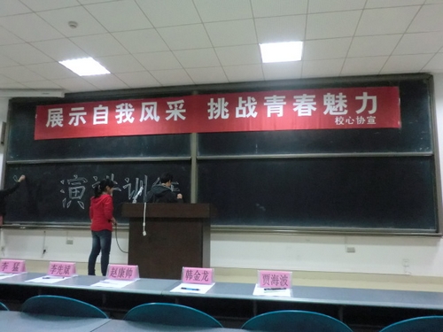 经过两期细致而专业的当众演讲培训之后,当众演讲训练营初期成果展暨预赛于11月4日晚7:00在图书馆东附属楼1101教室成功举办。担任本次成果展评委的是校心协副主席赵康帅,新闻网络部部长李猛,同伴联盟部部长韩金龙,办公室主任马文以及信息交流部部长贾海波。